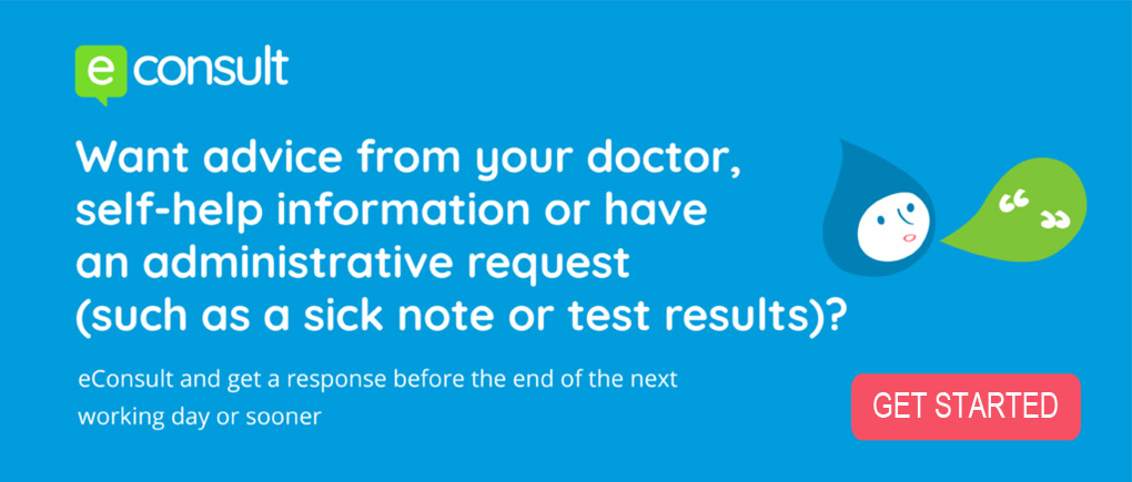 Banner titled "eConsult". Text reads "Want advice from your doctor, self-help information or have an administrative request (such as a sick note or test results)? eConsult and get a response before the end of the next working day or sooner" Text in pink background reads "Get Started". Animated image is visible